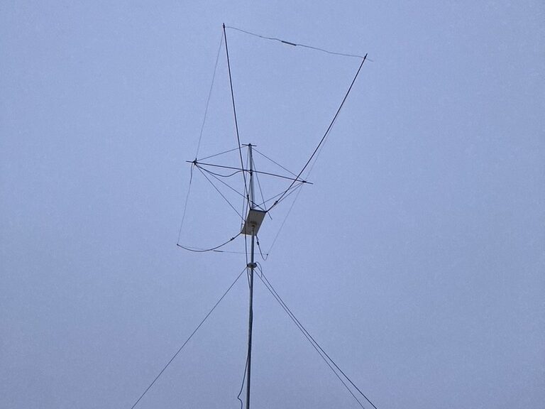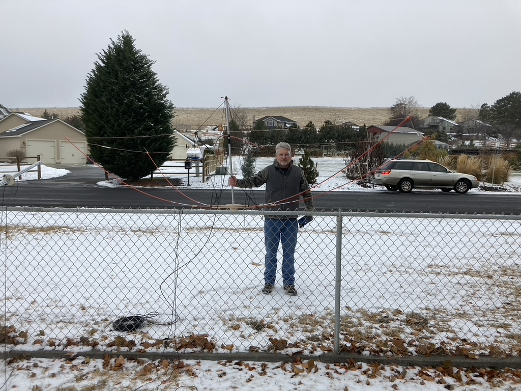 Along with two friends, Mike K7NT and Bob WV7W, I built a 10M Moxon antenna for use in the 2022 ARRL 10M contest. The driven element and reflector are made from 14g stranded wire and are held in their rectangular form by 5/16″ fiberglass driveway marker poles from Home Depot. The central hub is made of plywood. The first, simplest form of the structure was too floppy to support itself, so some improvised supports were made from a discarded painter’s pole and some para-cord. I doubt it would withstand a major windstorm but the result was pleasingly stiff and very lightweight. It is deployed 20′ high and is supported by two 10′ lengths of chain link fence top rail. The antenna’s bearing is adjusted using an “armstrong” rotator– we just ran out in the snow and moved it as needed. Total cost was less than $100.