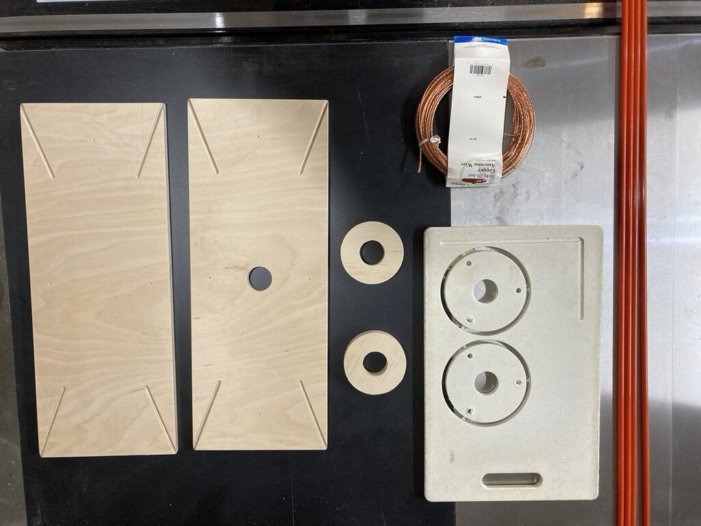 Here are all of the parts, machined and ready for assembly. Steel nut inserts were added to the plates to secure the fiberglass poles. The two plywood rings were glued and screwed to the bottom plate to support the hub and secure it to the mast. At right there are two rings machined out of an old plastic cutting board. These went around the mast and held guy lines. The antenna wire was from Radio Shack and had been following Mike around for decades!
