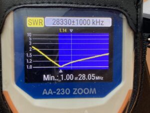 Our first attempt was based on the W4/VP9KF Moxon Antenna Calculator. This produced an antenna that tuned far higher than desired. We found this puzzling. We then noticed that the dimensions varied substantially from those in the QST article. We next tried Fred’s calculator, which produced dimensions that were longer, which would lower the resonant frequency and which matched those in the article very closely. In the end, our antenna resonated right at the bottom of the 10m band, but it was acceptable and we were out of time before the contest began.