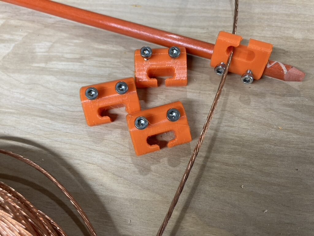 Bob also 3-D printed these nifty clips to capture the antenna wire at the end of the fiberglass poles. We ended up also using zip ties to secure the wire to the clips, which was mainly needed during assembly.