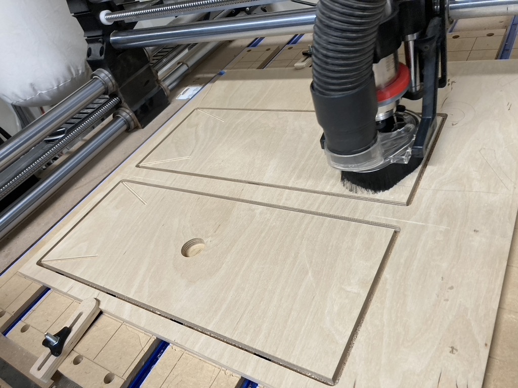 We decided on a mechanical design similar to the 6m Moxon shown on Fred Cirera’s Page. My experience is with woodworking so I thought to make the central hub out of plywood. Bob has a CNC router and a 3-D printer, and he offered to knock these parts out in his garage. The three of us drove over to his house, and a couple hours later we had everything cut out and ready for assembly.