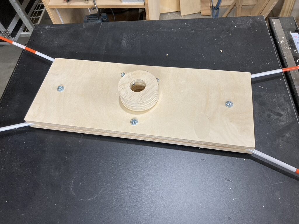 Here is the final hub assembly, upside down and ready for use. You can see two set-screws fitted to the donuts to secure the hub to the mast.