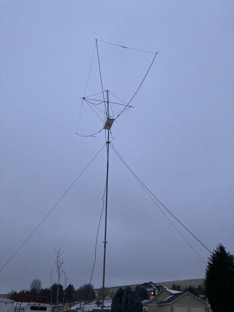 Along with two friends, Mike K7NT and Bob WV7W, I built a 10M Moxon antenna for use in the 2022 ARRL 10M contest. The driven element and reflector are made from 14g stranded wire and are held in their rectangular form by 5/16″ fiberglass driveway marker poles from Home Depot. The central hub is made of plywood. The first, simplest form of the structure was too floppy to support itself, so some improvised supports were made from a discarded painter’s pole and some para-cord. I doubt it would withstand a major windstorm but the result was pleasingly stiff and very lightweight. It is deployed 20′ high and is supported by two 10′ lengths of chain link fence top rail. The antenna’s bearing is adjusted using an “armstrong” rotator– we just ran out in the snow and moved it as needed. Total cost was less than $100.