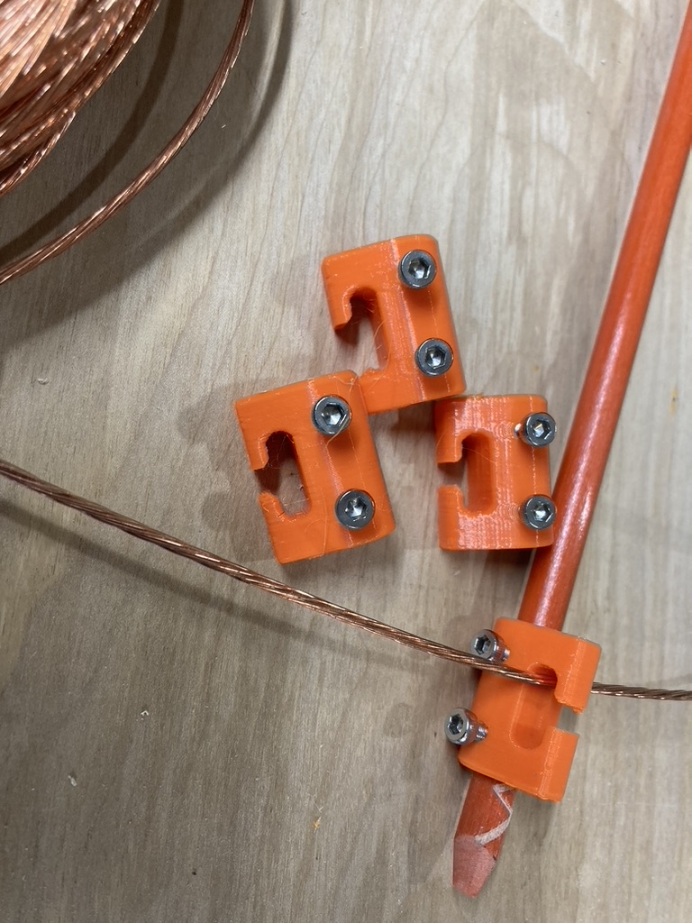 Bob also 3-D printed these nifty clips to capture the antenna wire at the end of the fiberglass poles. We ended up also using zip ties to secure the wire to the clips, which was mainly needed during assembly.